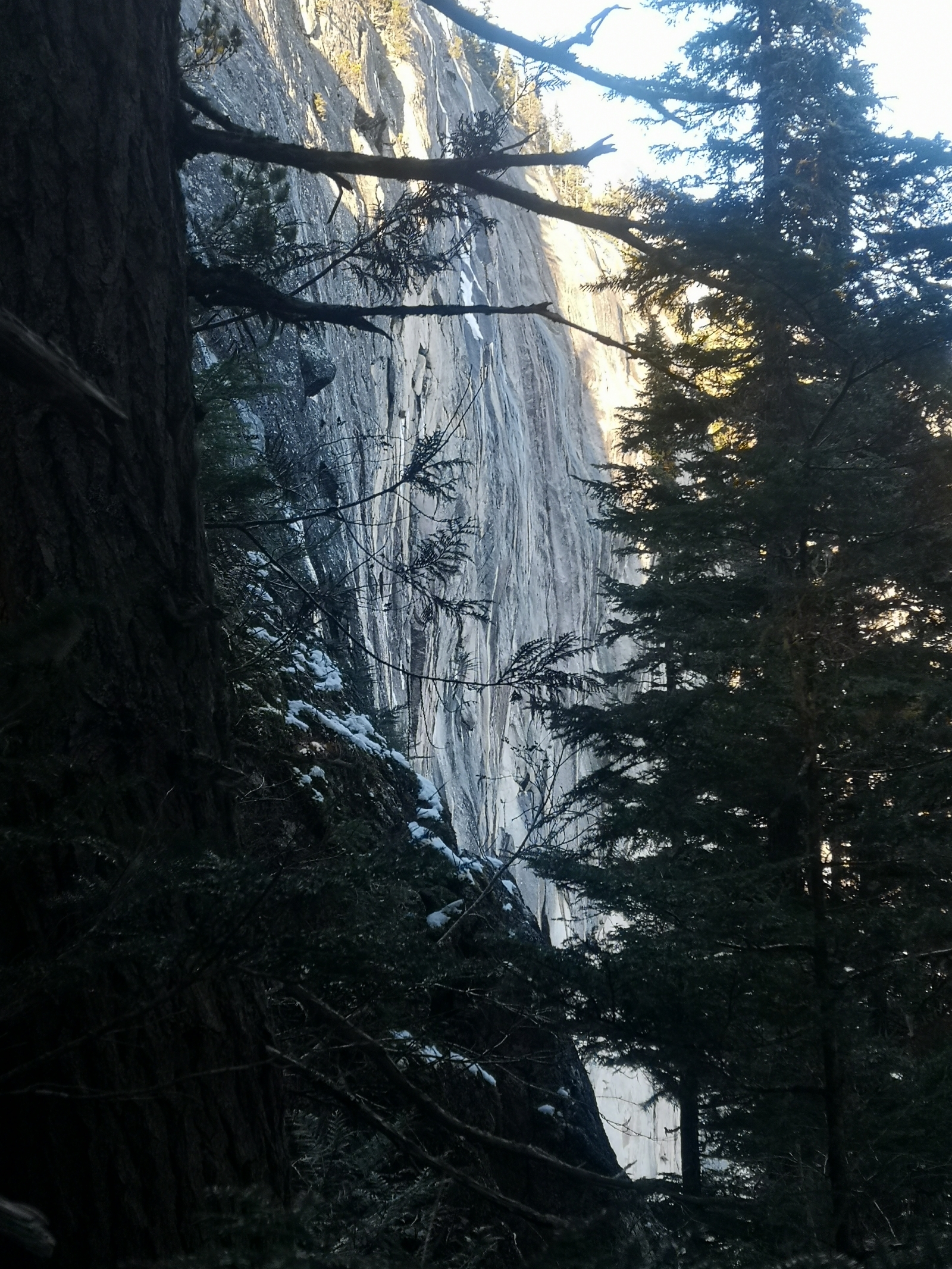 Cross the river, trend up and subtly left over easy ground along flagged route through old-growth Fir and Cedar forest, gradually closing distance to the main buttress feature of the trail ("the rocks") rising up on the left. After about 15min a well flagged and cut trail starts climbing more steeply up past a couple really massive Douglas Firs. Follow the trail over moderately-steep natural switchbacks through mossy oldgrowth, enjoying viewpoints and cliffbands every few hundred meters. Many points of interest, and generally great atmosphere.