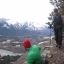 Pitch 3 - 5.10+ layback funkjam. Climb steeply through overlapping flakes to the top of a small pedestal and an old stunted pine tree. Mantle up into the groove above, and continue up a mix of flakes and cracks to easier ground. Enjoy the final face moves to gain the upper slab and anchors.