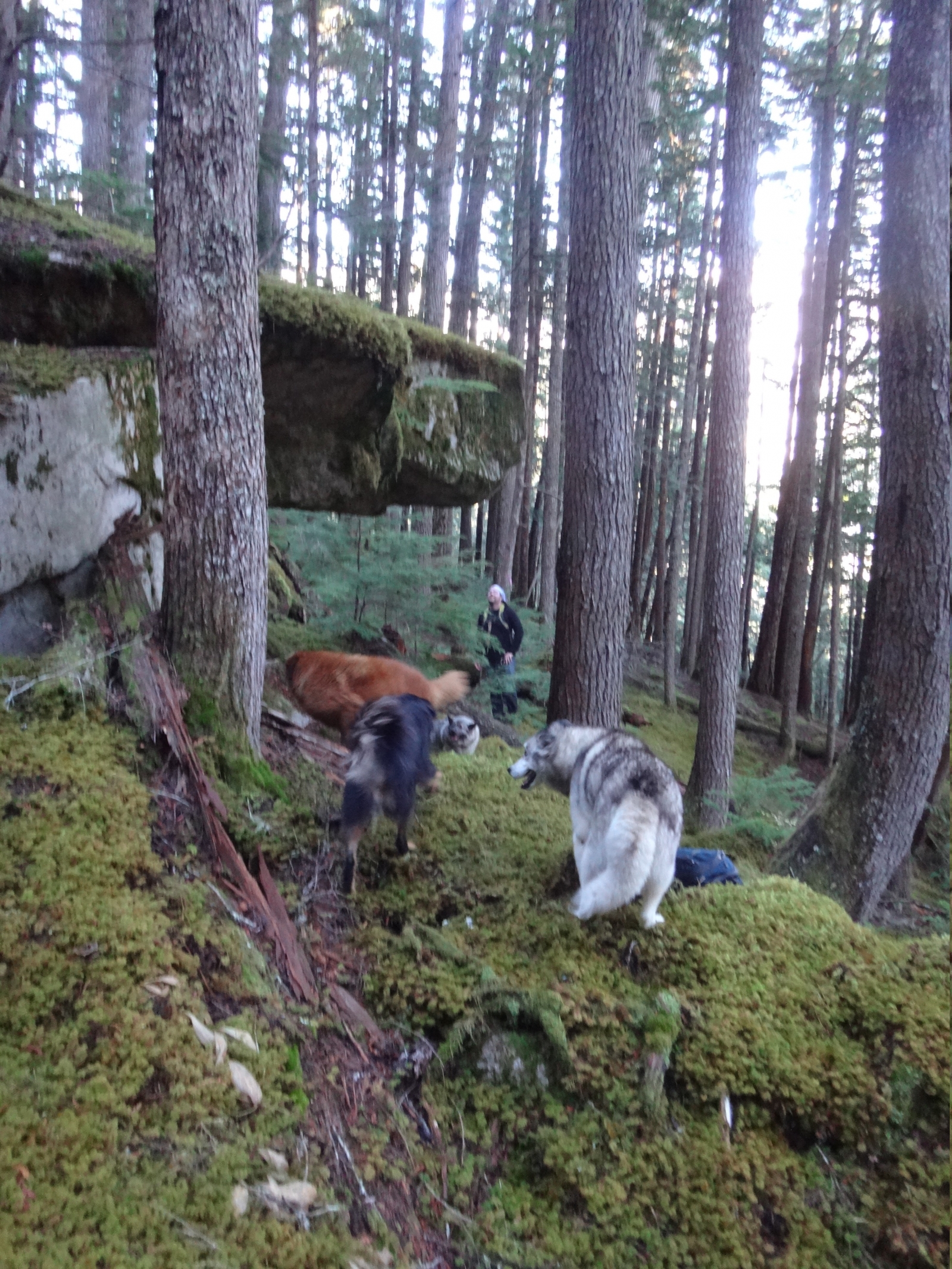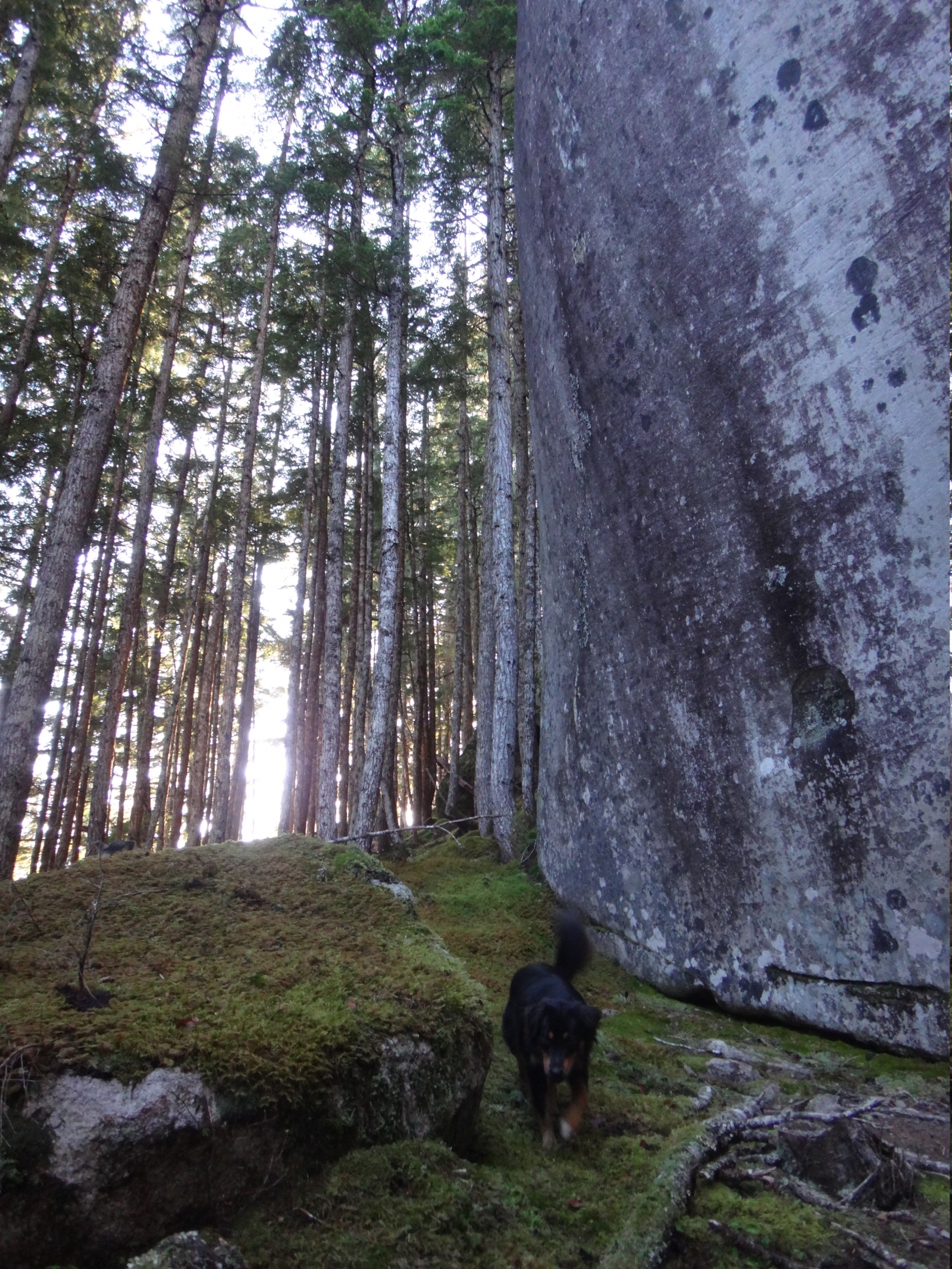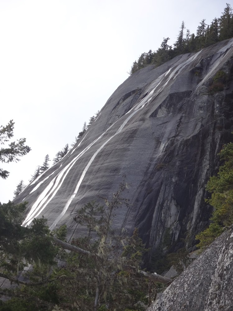Approach: Follow Saloompt Bluffs trail for about 45 minutes (approx 15 min past the lower-bluffs trail junction), just past a large area of blowdown, then depart the trail as it turns left at a very large Douglas Fir. Follow a flagged route directly upwards past the Fir tree, avoiding a section of blowdown, then gaining nice open timber all the way to the base of the wall.